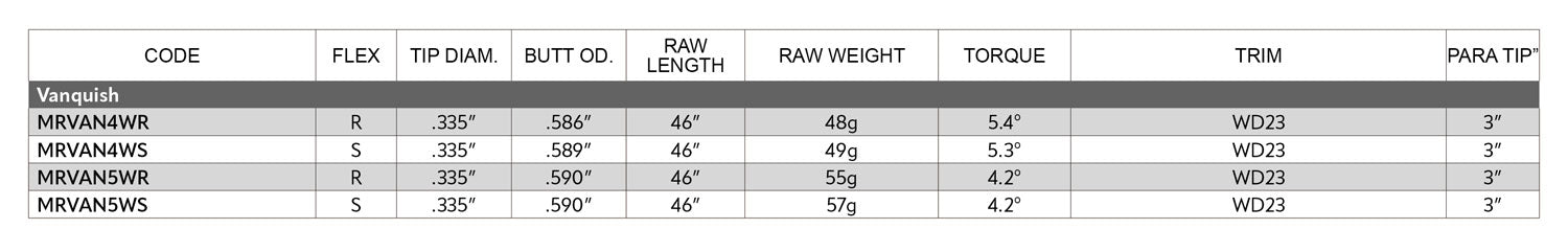 VANQUISH™ features six core technological tenets to deliver more consistency swing-to-swing and help you shoot lower scores: 1) a new Amorphous Wire Technology used in the butt section to increase clubhead acceleration, 2) a Super Low Resin Content Prepreg to drive resin content lower and increase carbon density for the best possible feel, 3) proprietary, exotic 46 and 40 Ton prepregs used in full-length applications for added strength and lower torque, 4) a uniquely fortified tip section with outer layer material angled differently for tip stability, 5) Consistent Feel Design to reduce the variables between weights and flexes to allow for ease of fitting, and 6) our Precision Crafted Design to ensure VANQUISH™ keeps the tightest possible tolerances in weight and frequency.