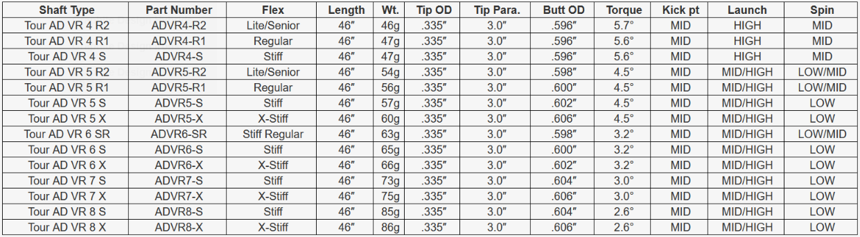 The Tour AD VR shafts are available in 40g R2, R1 and S flex, 50g R2, R1, S and X flex, 60g SR, S and X flex, 70g S and X flex and 80g S and X flex.